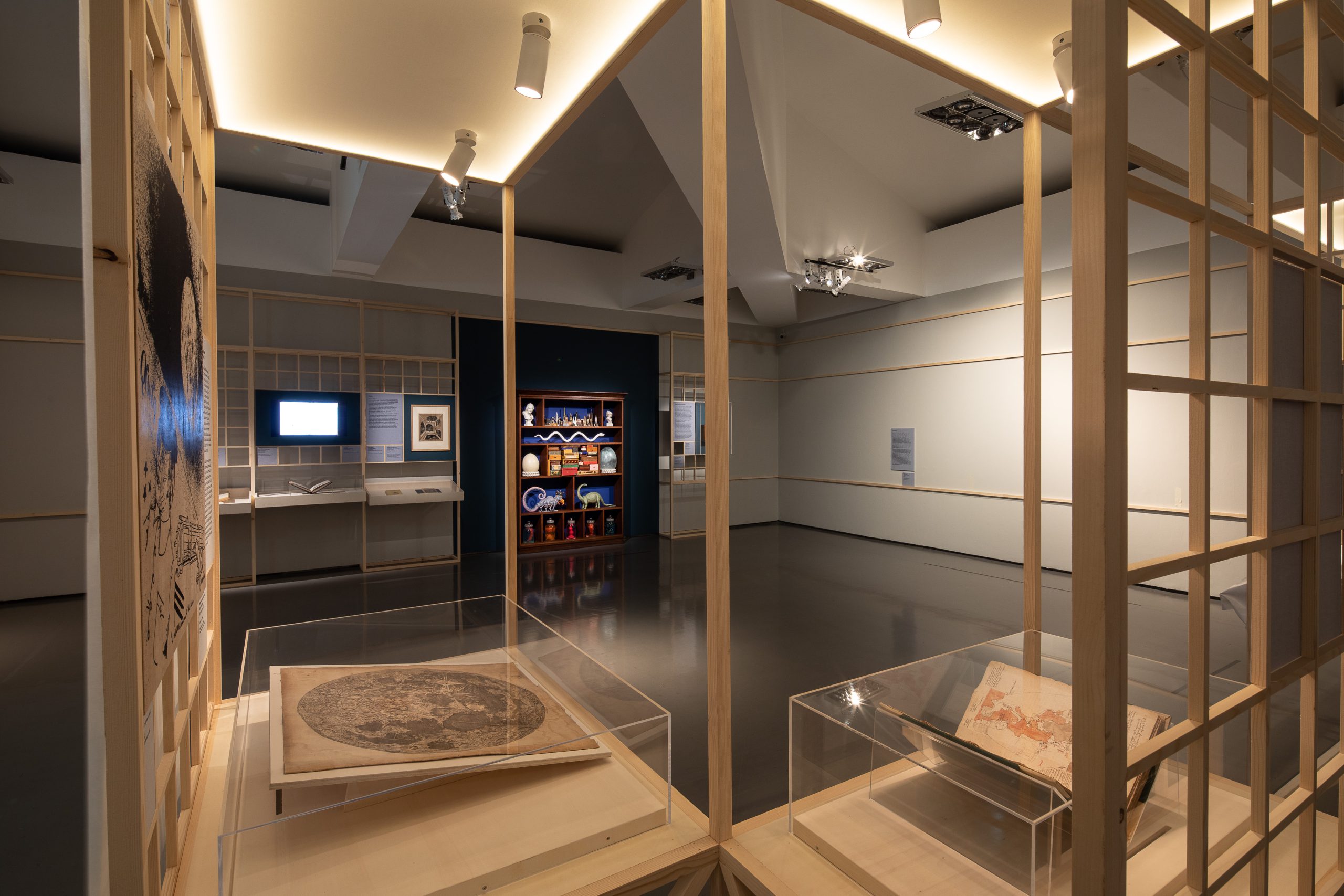 La sezione 7 è dedicata all’esperienza dei racconti cosmicomici, e più in generale, all’interesse di Calvino per l’astronomia, la geografia, la cartografia. Fra i pezzi esposti spiccano la mappa lunare di Gian Domenico Cassini e la rappresentazione del Mediterraneo del trecentista Opicino de Canistris, di cui si parla in Collezione di sabbia. Proprie dell’immaginazione cosmicomica sono poi l’antica, mai smentita attrazione per la forma del fumetto e la grande libertà inventiva, la commistione fra diversi piani del reale, ben presente anche nell’installazione di Mark Dion (vicino a Calvino anche per l’istanza archeologica ed enciclopedica).